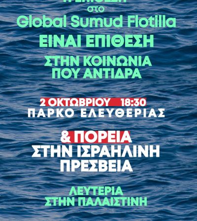 Πέμπτη 2/10, 18:30, Πάρκο Ελευθερίας / Κάτω τα χέρια από τον στόλο “Global Sumud Flotilla” – Λευτεριά στην Παλαιστίνη!