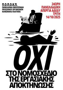 Η Π.Ο.Π.Ο.Κ.Π. καλεί όλες και όλους σε μαζική συμμετοχή στην 24ωρη Πανελλαδική Απεργία της Α.Δ.Ε.Δ.Υ. την Τρίτη 14 Οκτωβρίου 2025, ημέρα συζήτησης στην Ολομέλεια της Βουλής του αντεργατικού νομοσχεδίου που θεσμοθετεί τη 13ωρη εργασία, και σε δυναμικό «παρών» στις συγκεντρώσεις διαμαρτυρίας που θα πραγματοποιηθούν στην Αθήνα (Σύνταγμα, 11 π.μ.) και στην υπόλοιπη χώρα.