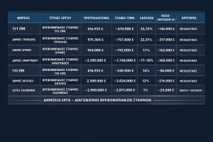 Τα στοιχεία του πίνακα δεν επιδέχονται αμφισβήτηση. Σε όλα τα παραπάνω έργα, με κανονικούς διαγωνισμούς και πραγματικό ανταγωνισμό, επιτυγχάνονται σημαντικές εκπτώσεις και το Δημόσιο εξοικονομεί συστηματικά εκατοντάδες χιλιάδες ευρώ, ενώ μόνο στη Δ.ΥΠ.Α καταλήγουμε στο 1% και σε ουσιαστικά μηδενική έκπτωση.