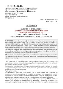 Η ΠΟΠΟΚΠ καλεί όλους σε μαζικό και αγωνιστικό ξεσηκωμό με συμμετοχή στα συλλαλητήρια για τα τρία χρόνια από το κρατικό έγκλημα στα Τέμπη, το Σάββατο 28 Φλεβάρη 2026, στις 12 μ., στην Πλατεία Συντάγματος και στην υπόλοιπη χώρα, μαζί με τον Σύλλογο Συγγενών Θυμάτων Τεμπών, την ΑΔΕΔΥ, Εργατικά Κέντρα, πρωτοβάθμια σωματεία και ομοσπονδίες, φοιτητικούς συλλόγους, μαζικούς φορείς και συλλογικότητες.