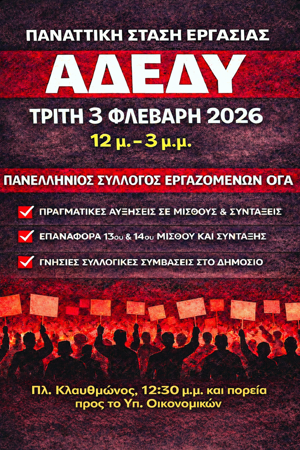 ΑΝΑΚΟΙΝΩΣΗ ΠΣΕ ΟΓΑ ΓΙΑ ΣΤΑΣΗ ΕΡΓΑΣΙΑΣ ΑΔΕΔΥ 3 ΦΛΕΒΑΡΗ 2026