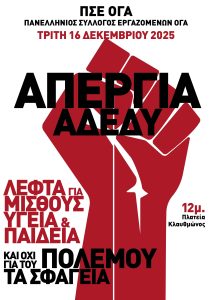 ΠΣΕ ΟΓΑ: Λεφτά για μισθούς, Υγεία και Παιδεία και όχι για του πολέμου τα σφαγεία (24ωρη απεργία ΑΔΕΔΥ 16/12/2025) 15 Δεκεμβρίου, 2025 ΠΟΠΟΚΠ 15 Δεκεμβρίου, 2025 Προηγούμενο Άρθρο ΠΣΕ ΟΓΑ: Όλες και όλοι, ενωμένοι, στον δρόμο του αγώνα – 16 Δεκεμβρίου 2025: 24ωρη πανελλαδική, πανδημοσιοϋπαλληλική απεργία ΑΔΕΔΥ για την ψήφιση του Προϋπολογισμού 2026 Επόμενο άρθρο ΠΟΠΟΚΠ για 24ωρη απεργία ΑΔΕΔΥ την Τρίτη 16/12/2025: Απεργούμε και διαδηλώνουμε ενάντια στον Προϋπολογισμό της αιματηρής λιτότητας και της πολεμικής οικονομίας