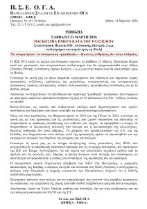 O ΠΣΕ ΟΓΑ καλεί σε μαζικό και δυναμικό «παρών» το Σάββατο 21 Μάρτη, Παγκόσμια Hμέρα κατά του ρατσισμού, στο αντιρατσιστικό συλλαλητήριο που θα πραγματοποιηθεί στην Αθήνα [Πλατεία Εθνικής Αντίστασης (πρώην Κοτζιά), 2 μ.μ.] και στην πορεία που θα ακολουθήσει προς τη Βουλή.